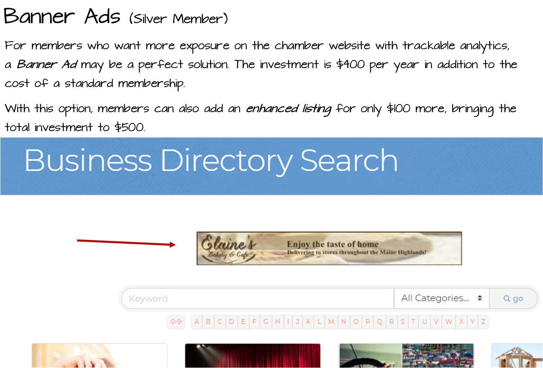 Member Advertising Options Advertising Options on the Chamber Website: For Details on the Gold Partner Logo on the Chamber's home page, click HERE. For Details on a Banner Ad, click HERE. For details on an enhanced listing, click HERE.